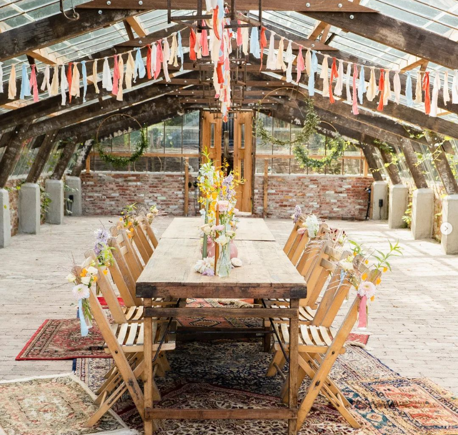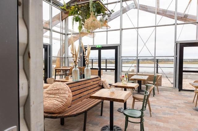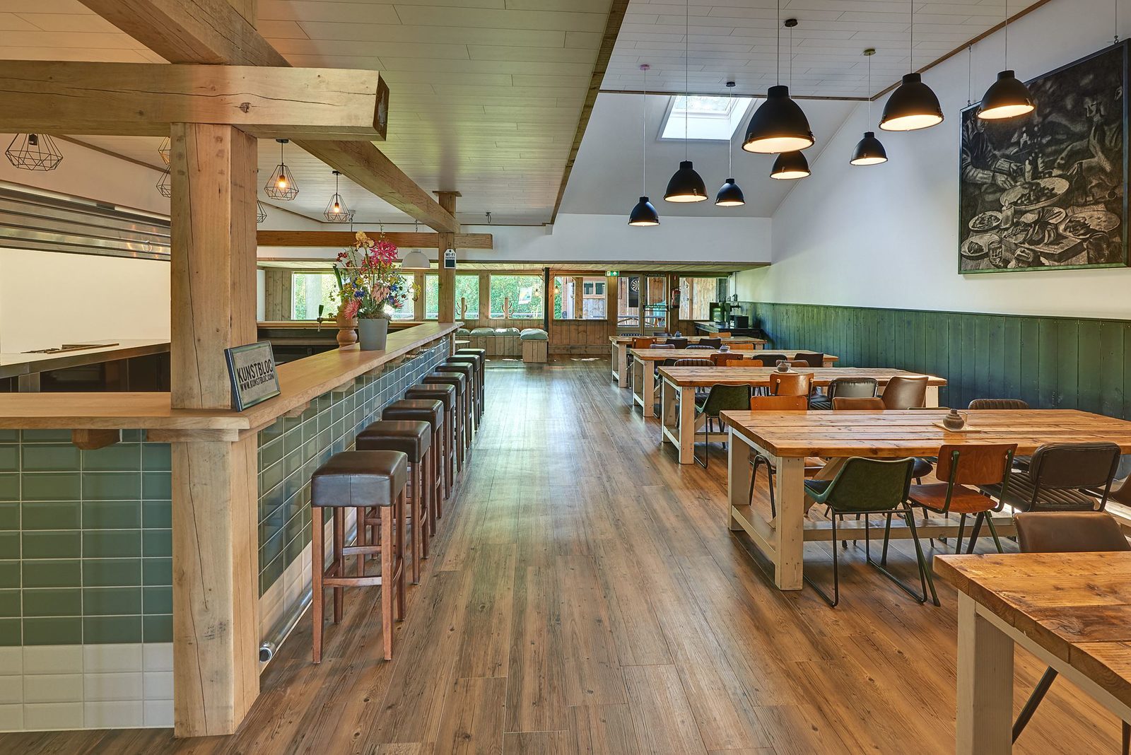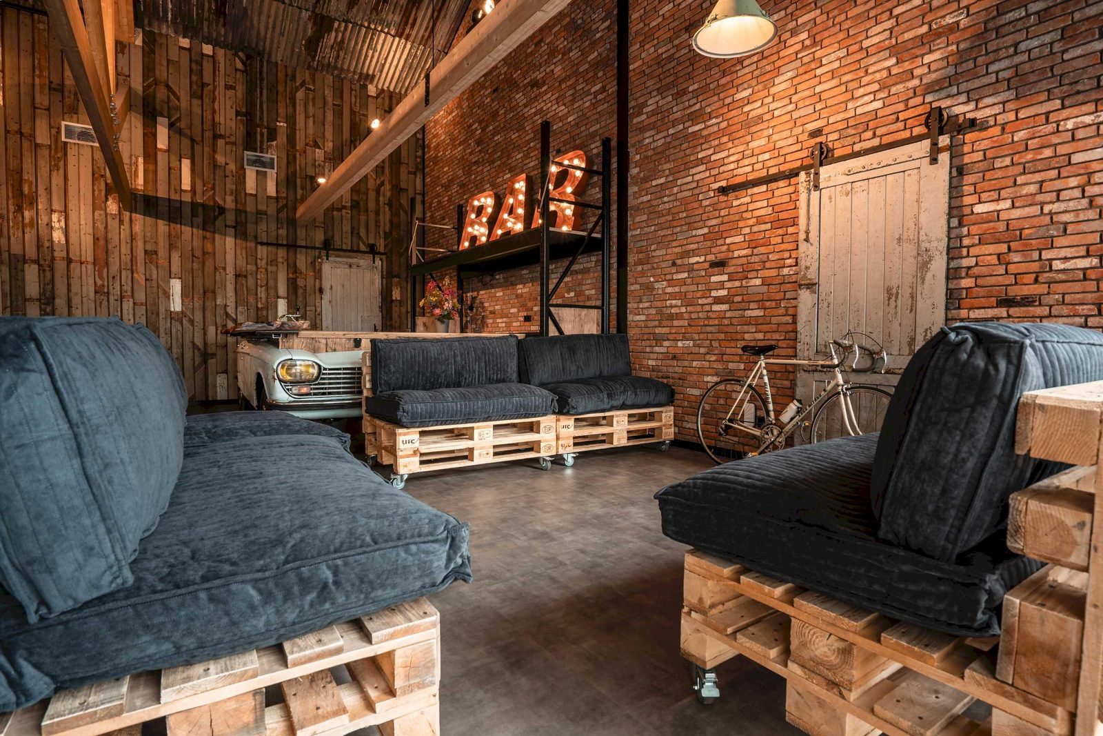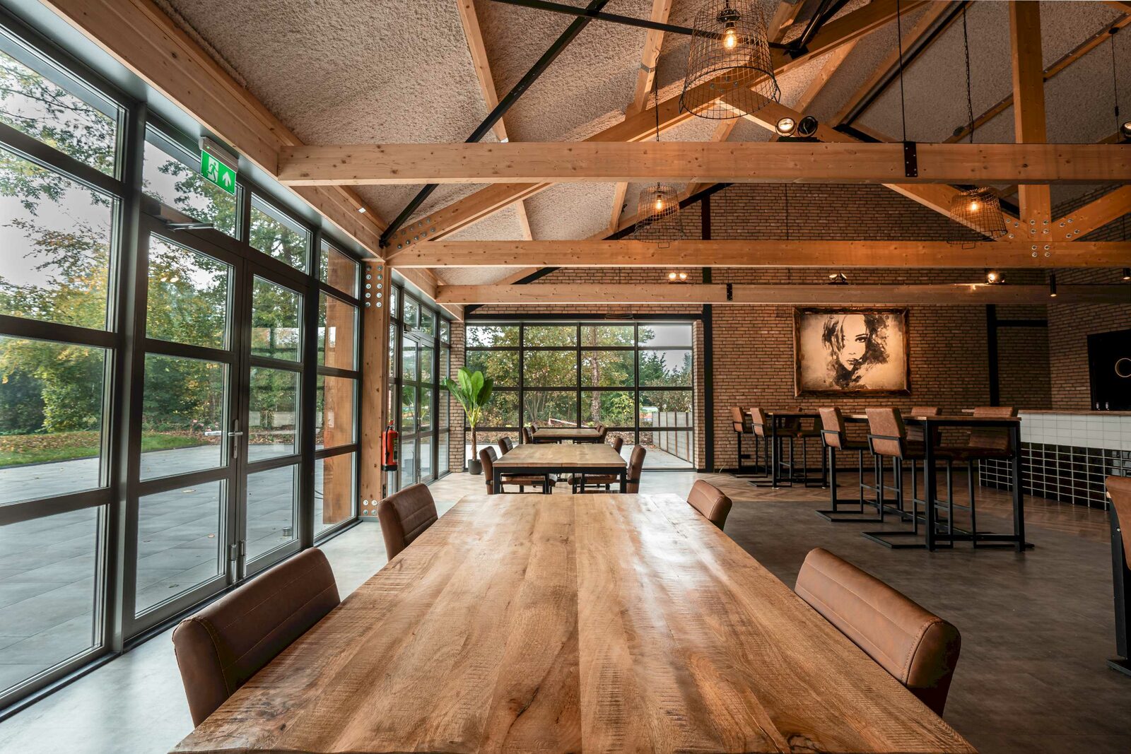 Grote industriële zaal met flexibele indeling van robuuste tafels en theaterdoeken voor aanpasbare ruimte. De ruimte heeft een prachtige bar met tapinstallatie en schuifdeuren naar het terras