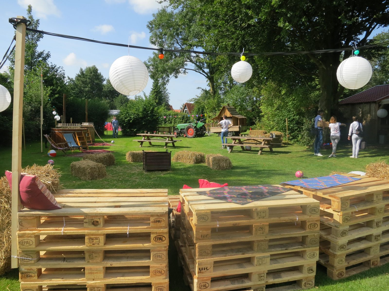 De grote groepstent is perfect voor gezamenlijke activiteiten en biedt een extra grote keuken, diverse eettafels, ruime zithoek voor ontspanning en een groot terras met comfortabel steigerhouten meubilair
